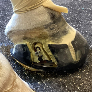 The first images are the day of resection. Second set of images is five weeks for a follow up shoeing. I chose the heart insert in the glue shoe with a pour on second application being we did get a substantial amount of growth in the first rotation. There would be no longer need for access through a hospital plate in this next rotation.