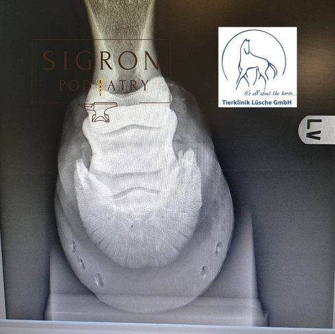 The MRI report mentioned an uneven contour of the lateral collateral fossa at the coffin bone with sclerotic bone remodelling reactions LF. Not an uncommon diagnosis by the way. Ok, so what does a farrier do? Supporting the lateral side of that left front a bit more, is definitely a good idea. But how? And how much? If my experience counts for anything: do not over do it!